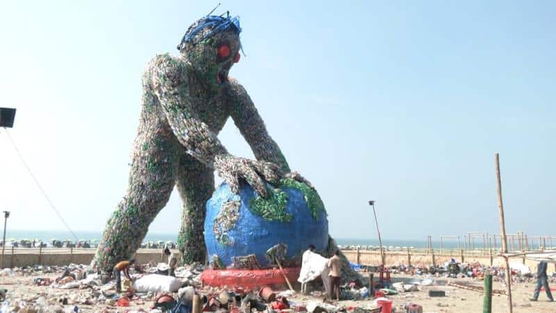 Around 10 tons of discarded plastic collected from the coastal area had been used to construct the 45-foot-high installation. Artists from the Faculty of Fine Arts at the University of Dhaka built the sculpture over 22 days, using plastic along with bamboo, wood, nails and adhesive materials.
