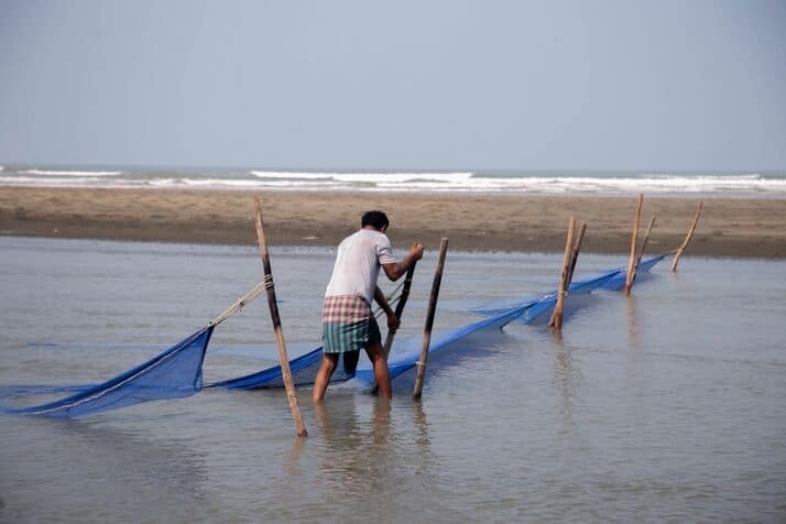 At Sonar Para Sea Beach, local fishers were seen preparing nets ahead of the morning tide, reflecting their enduring struggle with the sea. Planting bamboo stakes in the sand, they stretch nets tightly to catch shrimp fry carried in by the currents. Watching the waves closely, they gauge the water flow before the tide arrives, collecting bagda shrimp fry as they drift ashore.
